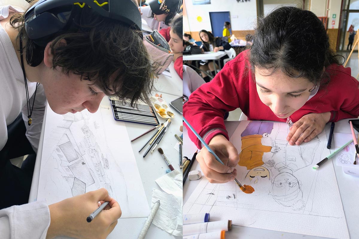 Durante la jornada, los alumnos utilizaron distintos tipos de lápices y papel para materializar sus ideas en un entorno creativo y colaborativo.