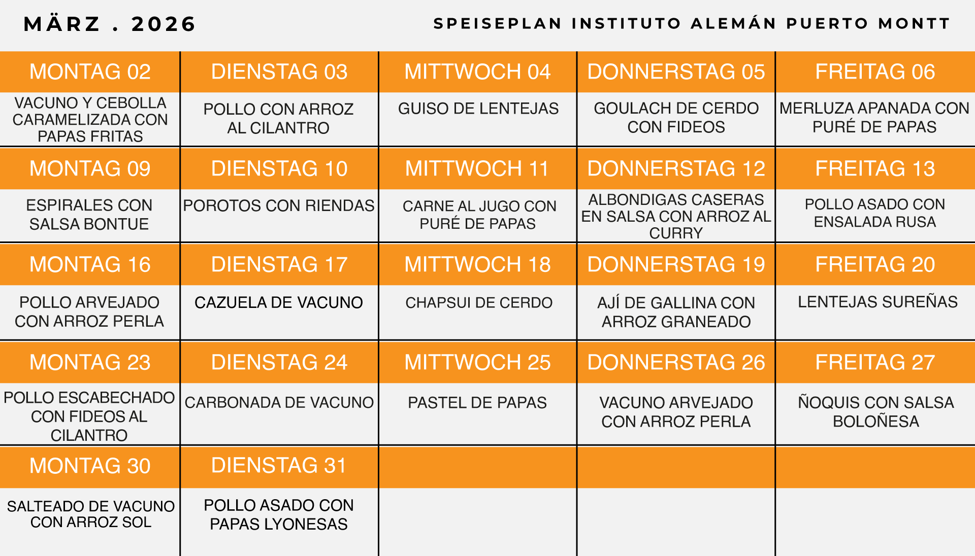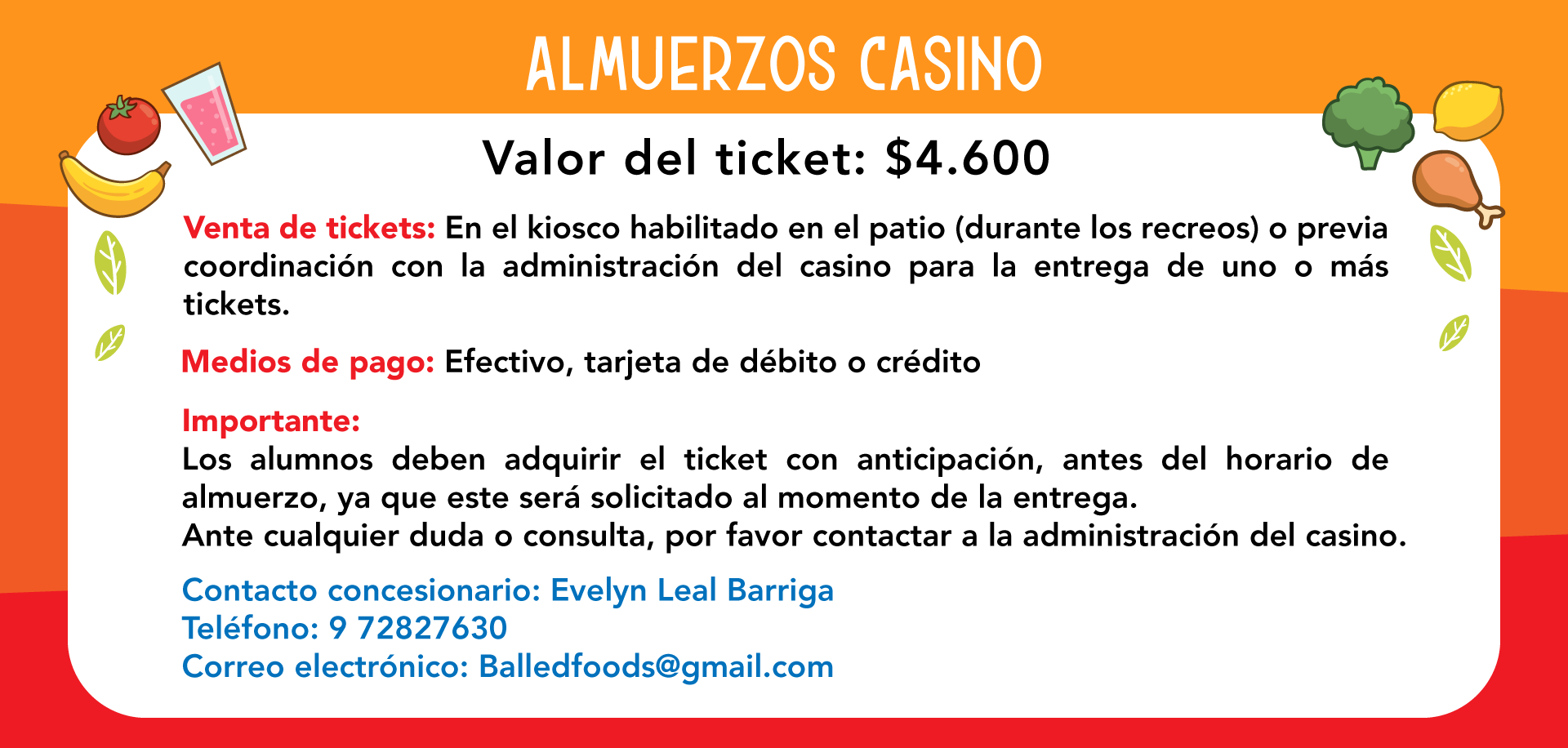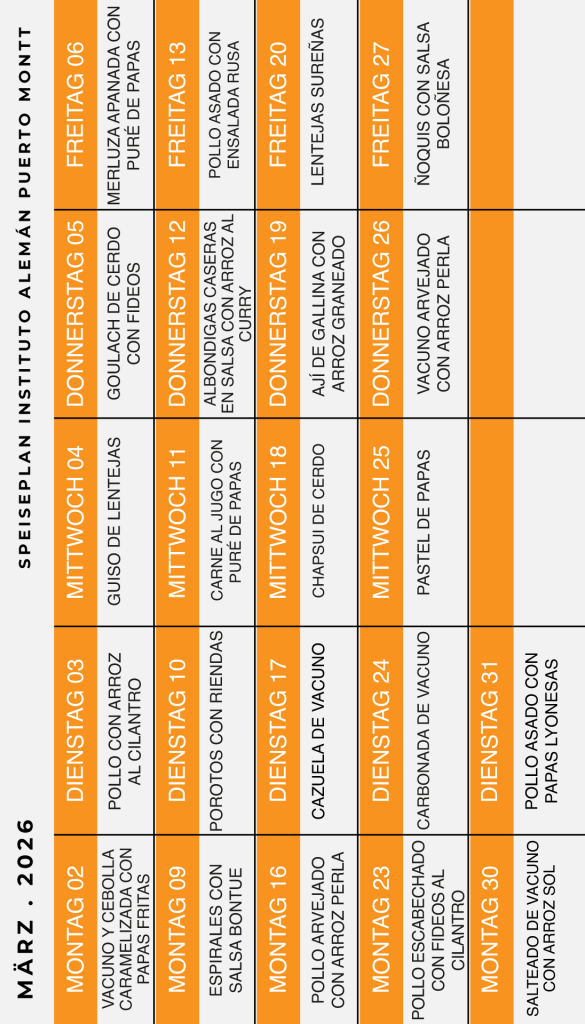 Menú Casino 2025 Tagesmenu VER TODAS LAS NOTICIAS DEL COLEGIO DATOS DE CONTACTO CONCESIONARIA: Servicios Gastronómicos Balled Foods Evelyn Leal Barriga, celular +56972827630 Balledfoods@gmail.com